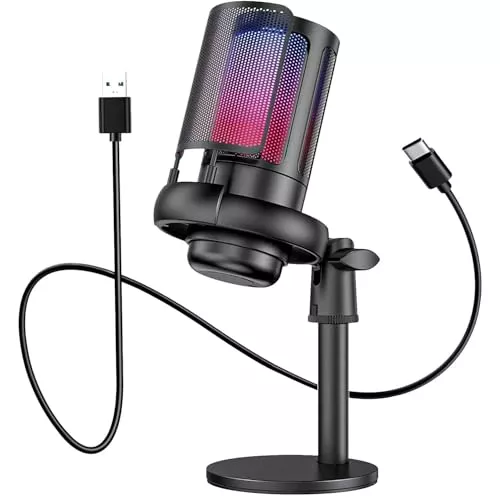 Pensado especialmente para streamers e criadores de conteúdo, este microfone condensador USB destaca-se pela combinação de iluminação RGB automática com sete modos de luz, criando uma atmosfera personalizada que eleva qualquer setup de gravação ou transmissão.