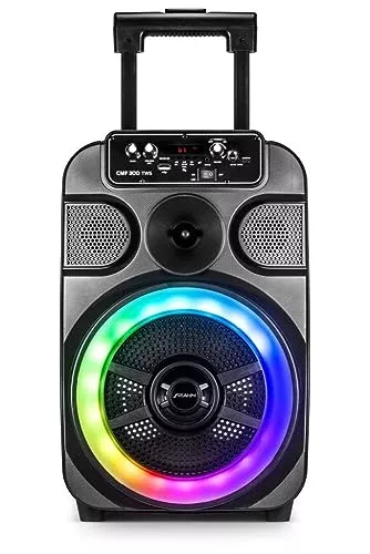 A Caixa de Som Ativa Multiuso CMF 300 TWS é uma solução versátil que entrega 300W RMS com um alto-falante de 8 polegadas e sistema acústico bass reflex, garantindo um som potente e claro para ambientes como igrejas.